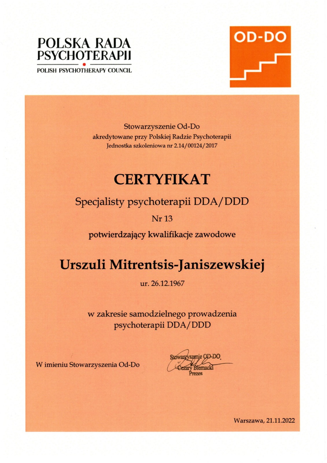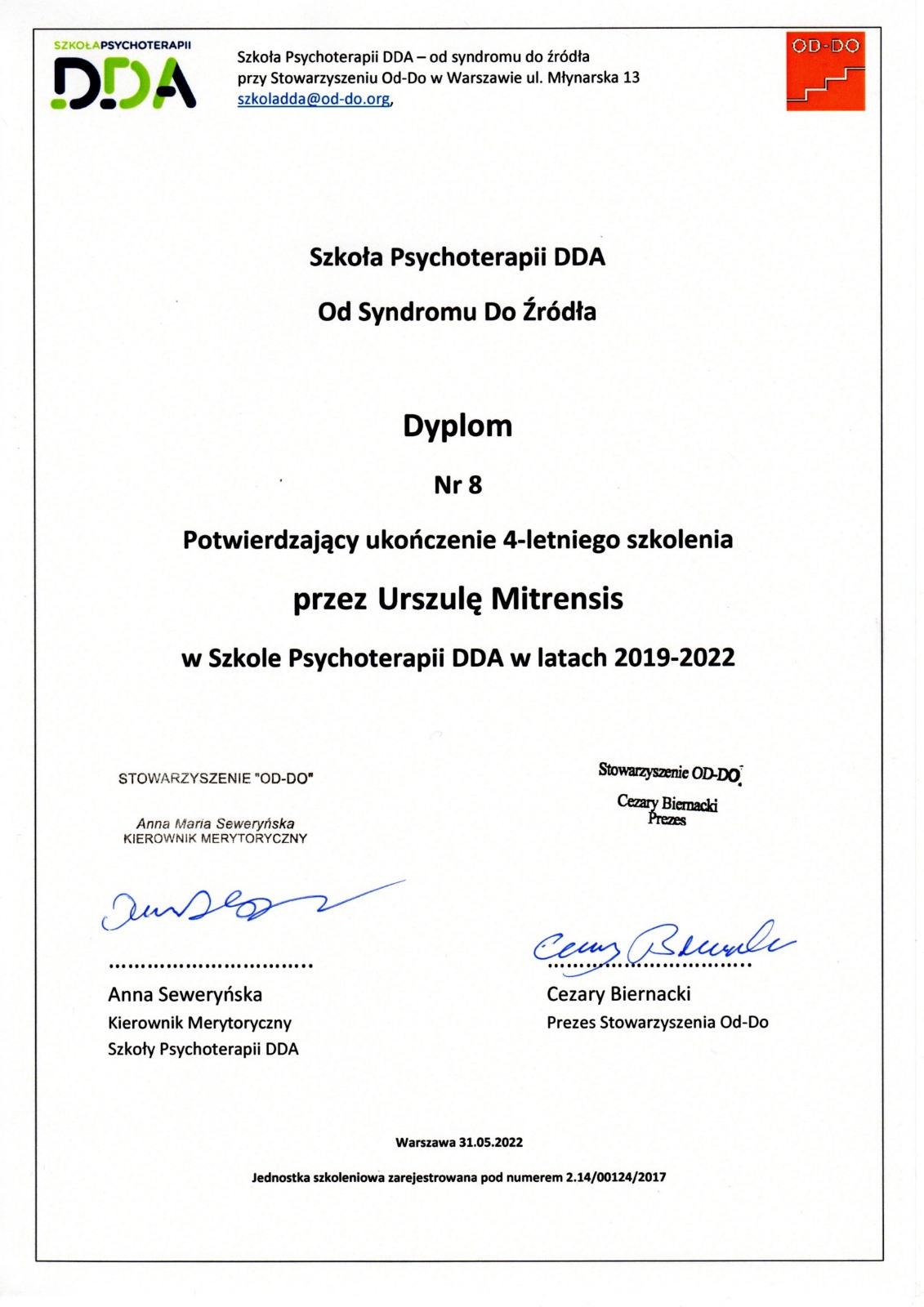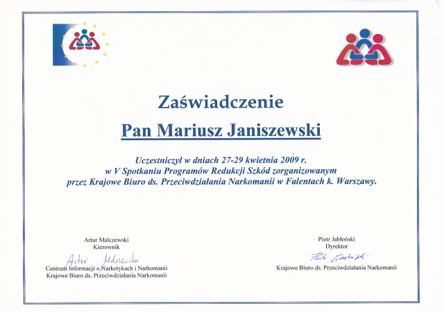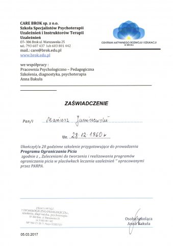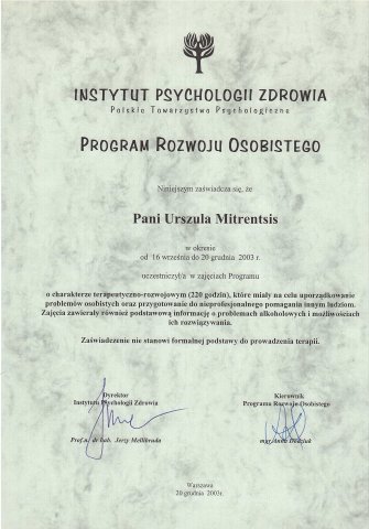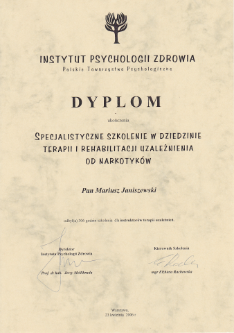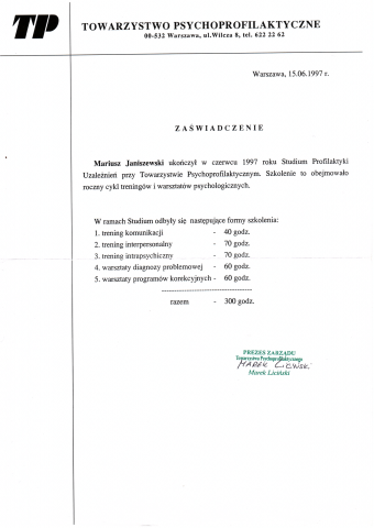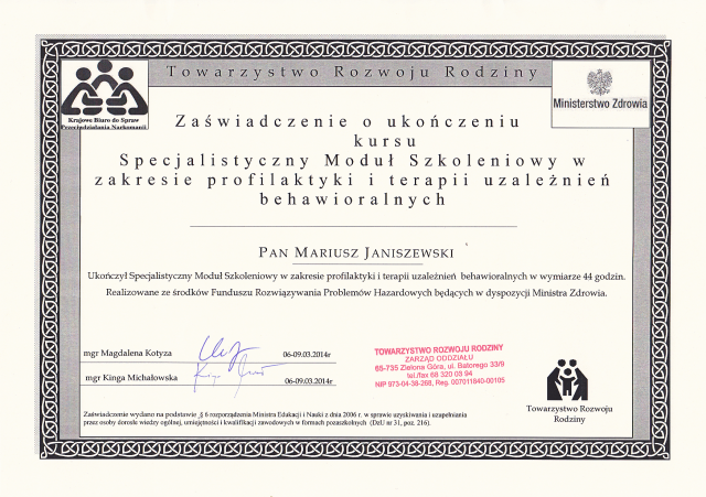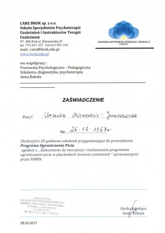 - ukończone Studium Terapii Uzależnień w Instytucie Psychologii Zdrowia