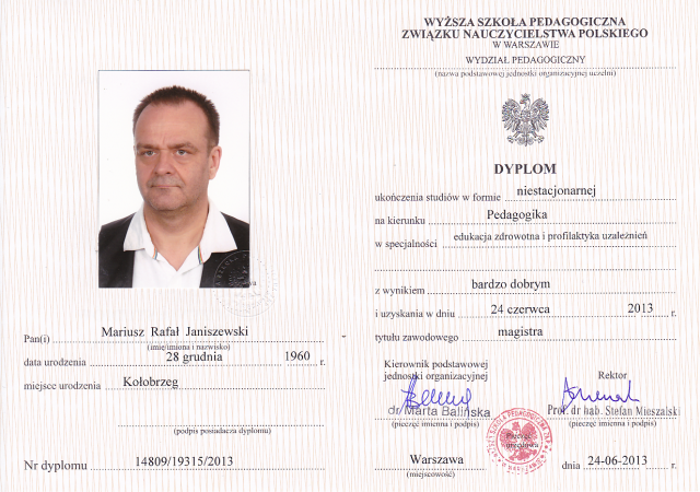 - ukończone Wyższe Studia Magisterskie w Wyższej Szkole Pedagogicznej Związku Nauczycielstwa Polskiego w Warszawie na kierunku Pedagogika, o specjalności: Edukacja Zdrowotna i Profilaktyka Uzależnień, tytuł magister pedagogiki
