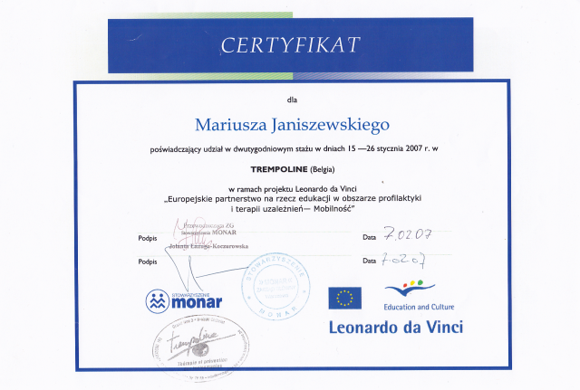 - staż w Ośrodku Terapii Uzależnień Trempoline (Belgia) - Europejskie Partnerstwo na rzecz edukacji w obszarze profilaktyki i terapii uzależnień