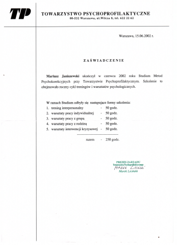 - Studium Metod Psychokorekcyjnych przy Towarzystwie Psychoprofilaktycznym