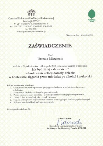 - kurs "Jak być bliżej z dzieckiem - budowanie relacji dorosły-dziecko w kontekście sięgania przez młodzież po alkohol i narkotyki" w Fundacji ETOH