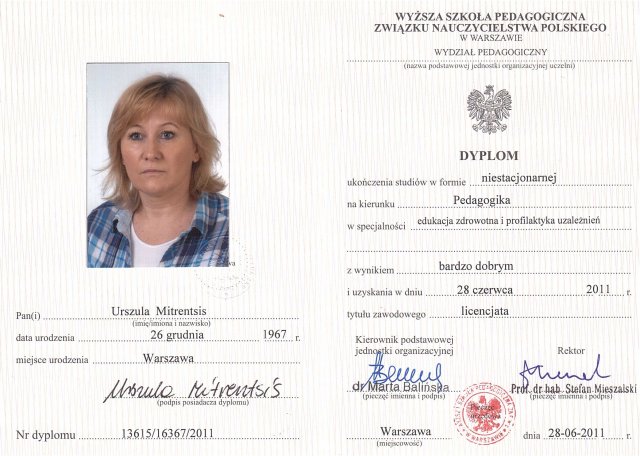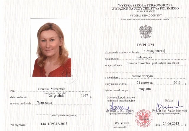 - ukończone Studia Magisterskie w Wyższej Szkole Pedagogicznej Związku Nauczycielstwa Polskiego w Warszawie na kierunku Pedagogika, o specjalności: Edukacja Zdrowotna i Profilaktyka Uzależnień